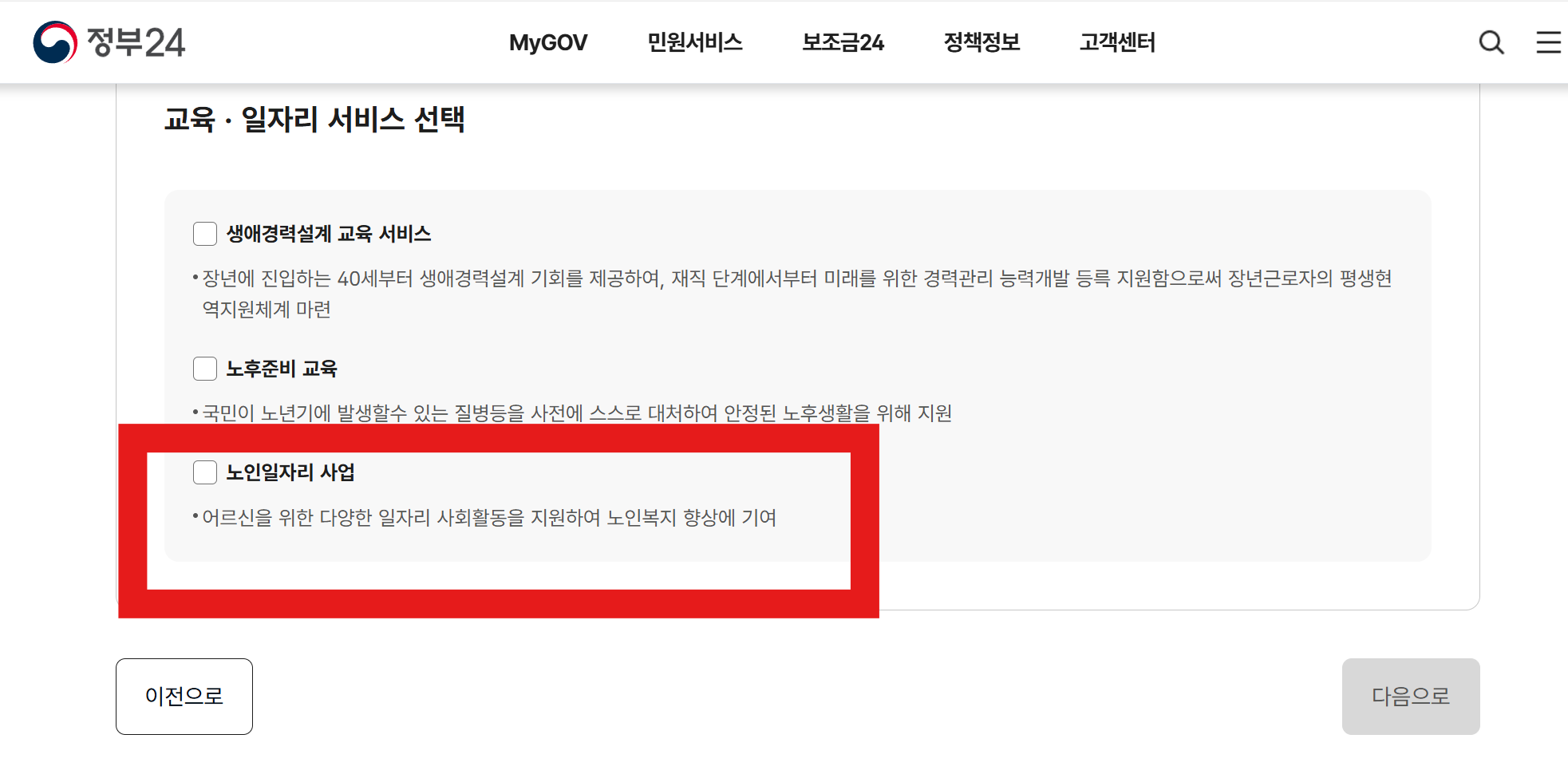 - 서비스 선택: 교육·일자리 서비스 목록에서 "노인일자리 사업"을 선택합니다.