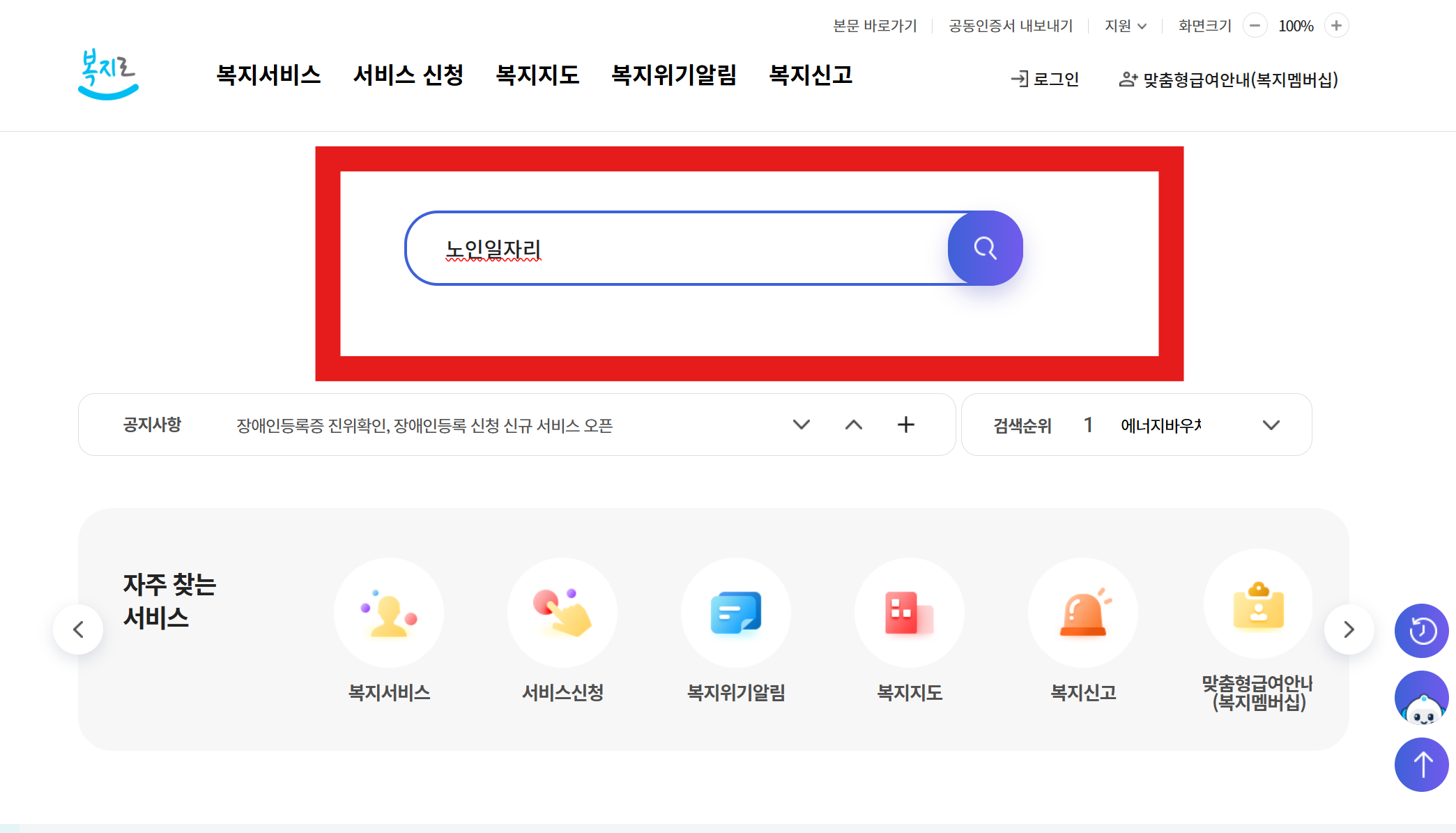 - 노인일자리 검색: 검색창에 "노인일자리"를 입력하고 검색합니다.