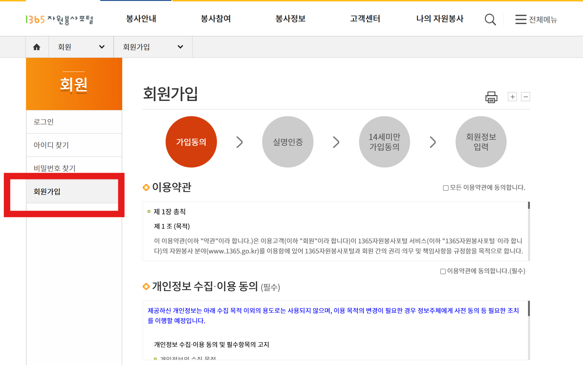 먼저 1365 포털에 접속해 회원가입을 진행합니다. 본인 인증(휴대폰 또는 아이핀)을 거쳐 개인정보를 입력하면 가입이 완료됩니다. 만 14세 미만의 경우 보호자 동의가 필요합니다.
